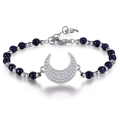 BRACCIALE ACCIAIO 316L CON CENTRALE A FORMA DI LUNA CON PAVE’ DI SWAROVSKI® BIANCHI, SFERE IN ACCIAIO E ELIOLITE BLU