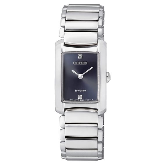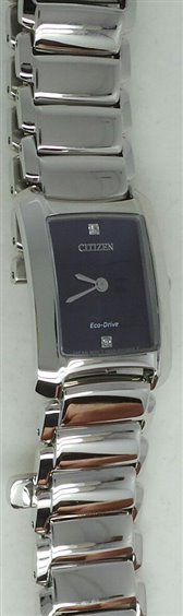 Movimento al quarzo, ora e minuti, Eco-Drive a carica luce con riserva di carica di 8 mesi. Cassa 20x30mm, spessore 7mm, bracciale in acciaio con chiusura a scomparsa con pulsanti. Quadrante nero lucido con due diamanti. Vetro zaffiro. Garanzia 2 anni.