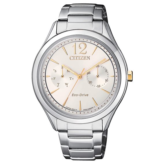 Orologio Donna solo tempo multifunzioni collezione Lady. Cassa in acciaio Lucido e satinato diametro 35mm. spessore 9/10mm. corona placcata oro giallo. Movimento Eco Drive a carica luce con riserva di carica di 180 giorni. Vetro minerale. Quadrante colore argento con indici e sfere dorate e contatori con funzione indicazione di giorno e data. Bracciale regolabile in acciaio lucido e satinato chiusura deployante a 2 pulsanti. Impermeabile 5 bar (5 atm.). Scatola Libretto Istruzioni e Garanzia 2 Anni Originali .