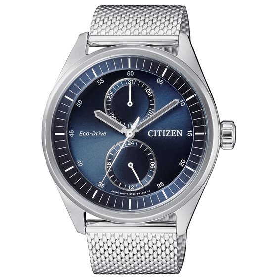 Orologio multifunzione. Cassa in acciaio lucido e spazzolato con fondo serrato a vite, ansa 22 mm. Movimento Eco-Drive a carica luce con riserva di carica 180 giorni. Vetro minerale. Quadrante blu, lancette bianche e luminose, contatori giorno e data. Bracciale regolabile in acciaio, modello maglia milanese. Garanzia 2 anni.