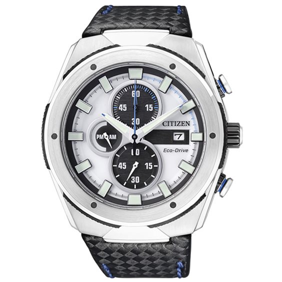 Orologio con cassa in acciaio e fondo serrato a vite, cinturino in tessuto tecnico e vetro minerale. Movimento Eco Drive (a carica luce infinita) con riserva di carica di 7 mesi. Cronografo a 1/5 di secondo, datario e visualizzazione 24 ore.