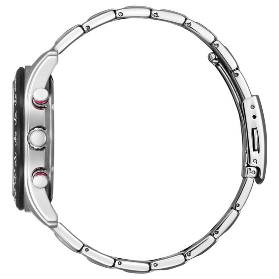 Orologio Cronografo Uomo della Collezione Crono Sport. Cassa in acciaio lucido e satinato, ghiera fissa con scala tachimetrica in acciaio con trattamento IP (Ion Plated) nero opaco. Fondello serrato a vite. Movimento al quarzo Eco-Drive a carica luce con riserva di carica di 270 giorni con funzione di cronografo a 1/5 di secondo fino a 60 minuti. Quadrante nero con indici in acciaio spazzolato e punti luminescenti come lancette ore-minuti. Vetro minerale. Bracciale regolabile in acciaio satinato e lucido, chiusura deployante con pulsanti. Impermeabile 10 bar (10 atm). Scatola e Libretto Istruzioni Originali. Garanzia 2 anni.