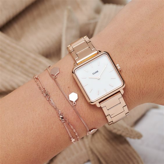 Orologio Cluse La Tetragone al quarzo da donna, Quadrato 28,5x28,5mm, spessore 7mm, Peso 68gr. Vetro minerale, quadrante madreperla bianca, cassa in acciaio rosato 3 atm, bracciale in acciaio rosato.