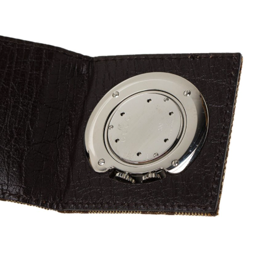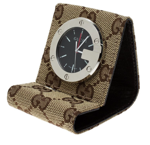 Tenere d'occhio l'ora diventa un'esperienza piacevole con questo orologio (con sveglia) da tavolo o da viaggio firmato Gucci. La sua cassa a forma di G in acciaio inossidabile è dettagliata con motivi a vite e si trova incastonata nel classico tessuto GG. Diametro cassa: 48 MM Tipo di movimento: Quarzo Materiale della cassa: Acciaio inossidabile Materiale del braccialetto: tessuto e pelle