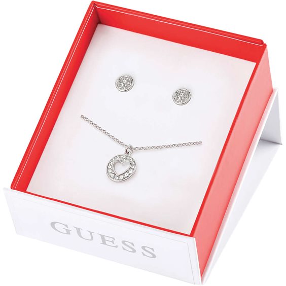 Boxset regalo Guess parure collana motivo cuore e orecchini tondi. Materiale acciaio e cristalli.