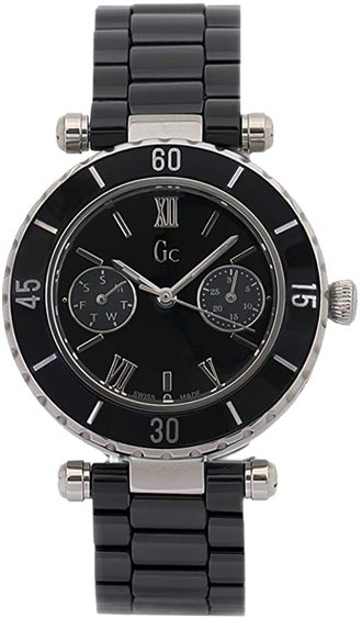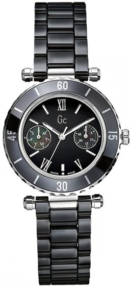Orologio Guess I35003L2 da donna. Cassa 34 mm in acciaio lucido. Lunetta in ceramica nera. Quadrante nero con dettagli argento e contatori in madreperla nera. Cinturino bracciale in ceramica nera. Multifunzione. Water Resistant 10 ATM. Swiss made.