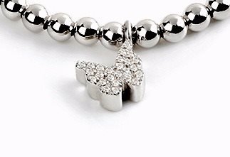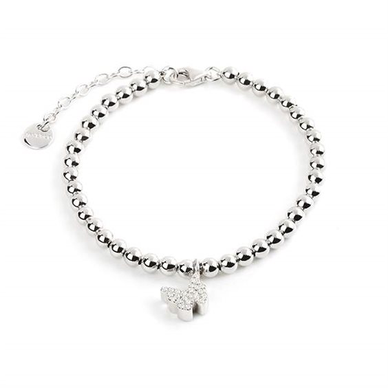 Bracciale a palline e ciondolo in 3d a farfalla con pavè di zirconi. Catenella finale per regolare la lunghezza.