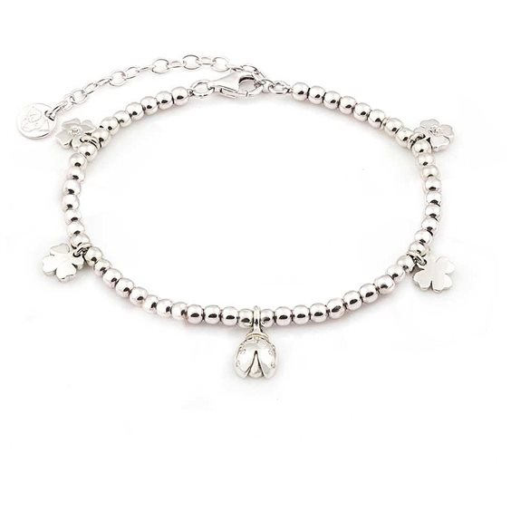 Bracciale in argento Jack&Co con pendagli a quadrifoglio e coccinella con zirconi. Misura da 15 a 19 cm. Made in Italy.