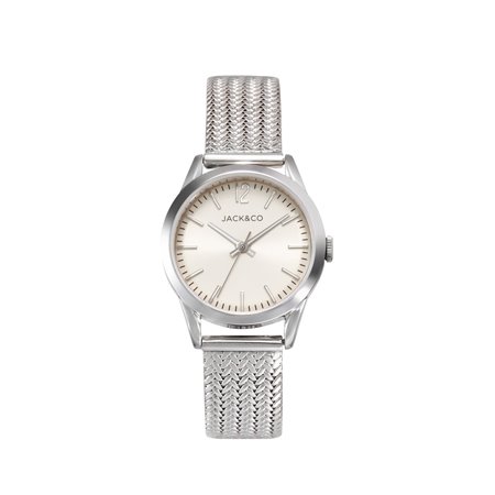 Cassa (28 mm) in acciaio lucido / Quadrante avorio con dettagli silver / Bracciale mesh acciaio lucido effetto vintage/ 5 ATM larghezza cinturini mm 14 lunghezza totale orologio cm 24. certificato di garanzia