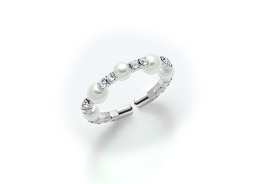 Anello in ottone Kiara con perle e pietre sintetiche. Anello aperto che si adatta a mote misure.
