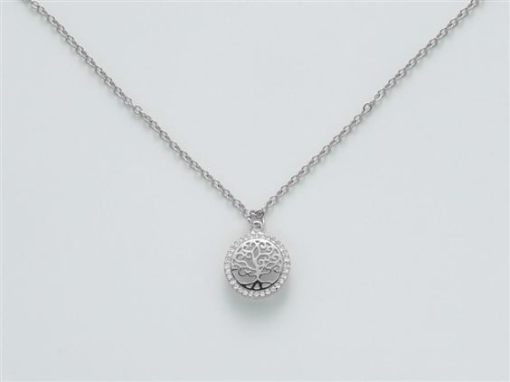 Collier Kiara motivo albero della vita in ottone e pietre sintetiche. Chiusura con anellini per regolazione della lunghezza.