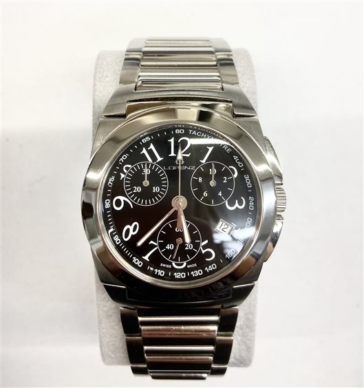 Orologio cronografo da uomo Lorenz. Swiss Made. Cassa e cinturino in acciaio. Quadrante nero. Water resistant 5 ATM.
