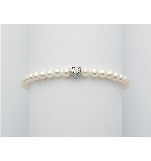 Bracciale in oro bianco 18 KT con perle F.Water diametro 5/5.5 mm. Con cuoricino centrale in oro bianco con incastonato un piccolo diamantino.