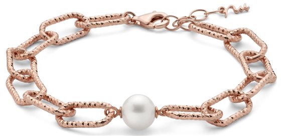 Bracciale in argento 925 finitura rose gold. Perla centrale bianca, coltivata, mm 9/9,5. Maglia catena diamantata. Misura regolabile da cm 19 a cm 21.