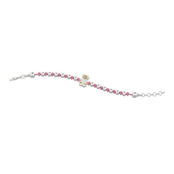 BRACCIALE IN ARGENTO E CORDINO CON CHIUSURA REGOLABILE. Il bracciale con l'orsetto Tato dai piccoli nodini e perline d'argento, addolcisce il polso del tuo bambino/bambina. Nel colore rosa.