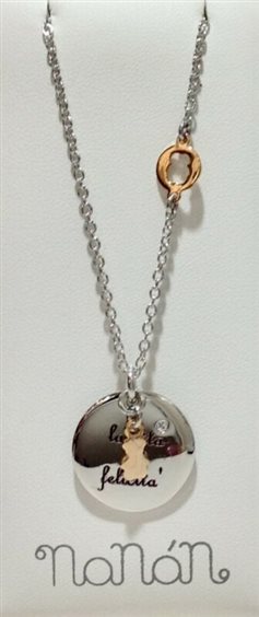 Collana in puro argento 925 della collezione Nanàn Bijou. La collana ha un ciondolo tondo con inciso in rosso 'la vita è felice', impreziosito con pietra cubic zirconia e un dolce orsetto in rosa attaccato come pendente.