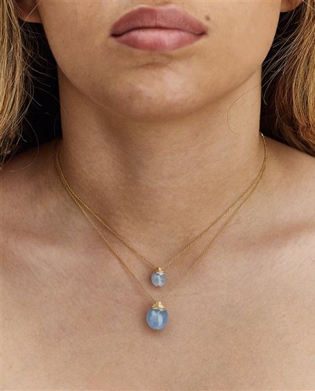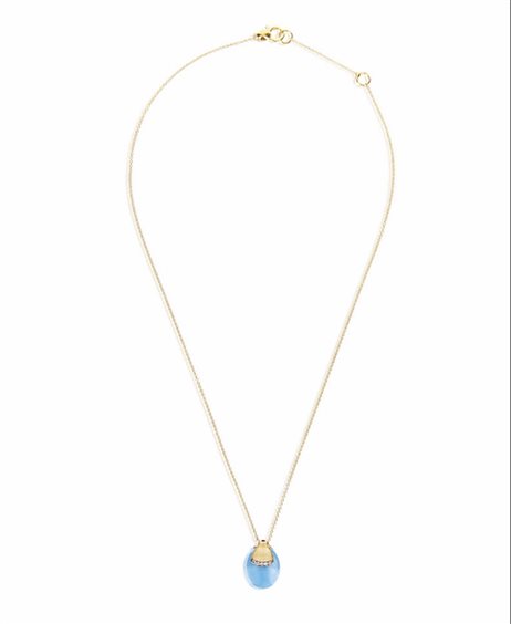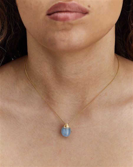 Raffinata collana in oro 18kt e acquamarina milky coronata da eleganti dettagli di diamanti. La sofisticata lavorazione in oro gioca con la luce e con la pietra naturale, nota anche per la sua capacità di favorire la crescita interiore e l’introspezione. Ref. CS3-587 Lunghezza 42,50 cm DIAMANTI: - Peso (totale): 0.04 CT - Purezza: VS - Colore: G - Taglio: brillante rotondo Pietre colore: - ACQUAMARINA MILK Peso (totale): 12.50 CT