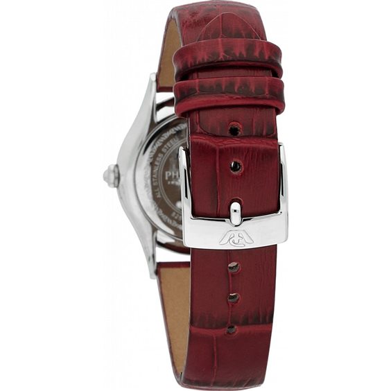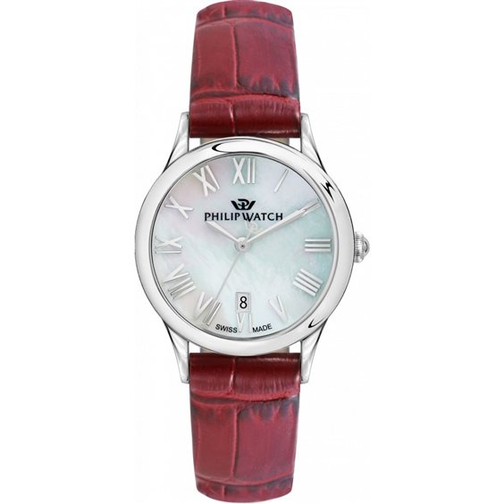 Orologio Philip Watch Donna collezione Marilyn. Cassa 31 mm. Quadrante in madreperla con calendario. Vetro in zaffiro. Resistente all’acqua 5 ATM. Cinturino in vera pelle stampato coccodrillo rosso.