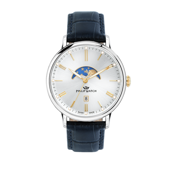 OROLOGIO PHILIP WATCH MOVIMENTO AL QUARZO CON DATARIO E FASI LUNARI, VETRO ZAFFIRO ANTIRIFLESSO, FONDELLO A VITE, FINITURE IN ORO GIALLO, CORONA A PRESSIONE. cinturino con chiusura deployante.