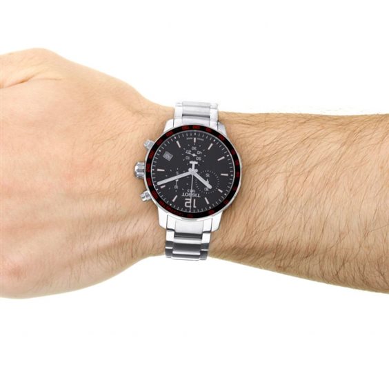 OROLOGIO CRONOGRAFO AL QUARZO CON CASSA DI FORMA ROTONDA QUADRANTE NERO CON INDICI E LANCETTE FLUORESCENTI, DATARIO A ORE 4 CINTURINO IN ACCIAIO CON CHIUSURA DEPLOAYANT CON SICURA.