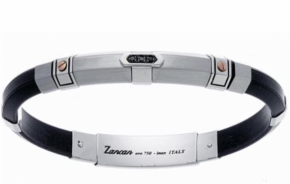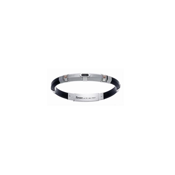 Bracciale da uomo Zancan in caucciù con acciaio, argento gr 2,5 e oro rosa gr 0,10. Al centro ci sono 3 cristalli neri. Chiusura regolabile.